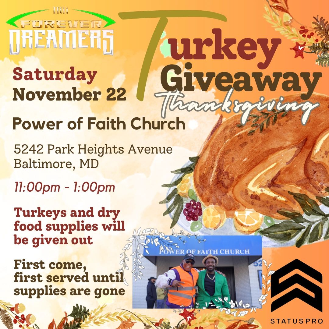 The Forever Dreamers Foundation is hosting our annual Thanksgiving Turkey Giveaway Saturday, November 22 from 11am-1pm at the Power of Faith Church in Baltimore.